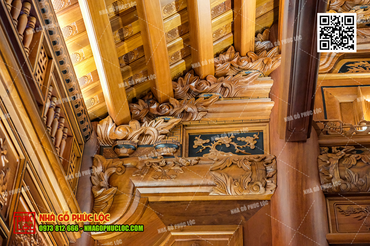 - Một số loại hoa văn có ở nhà gỗ Việt Nam có thể kể đến như: hoa văn tứ linh, hoa văn lá lật, hoa văn tứ quý hóa rồng,. Mỗi họa tiết đều được các nghệ nhân đục chạm tỉ mỉ, tinh tế. Mỗi hoa văn có ý nghĩa riêng với mong muốn mang đến nhiều điều tốt đẹp cho gia chủ.