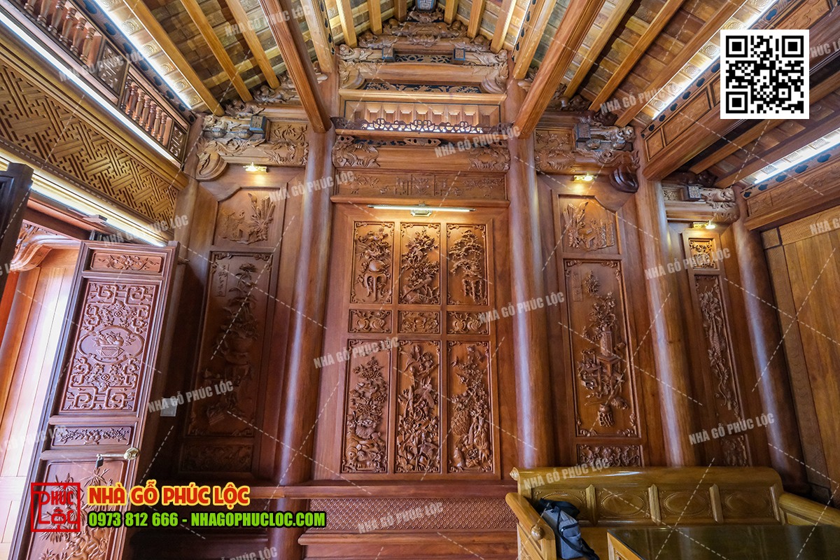 - Nội thất trong không gian nhà gỗ truyền thống có thể kể đến như: bộ trường kỷ, sập gụ tủ chè, án gian,… Thường nhà gỗ sẽ có công năng là nhà thờ họ vì vậy đồ nội thất quan trọng nhất chính là bàn thờ. Bàn thờ có nhiều loại như: án gian, sập thờ, tủ thờ.