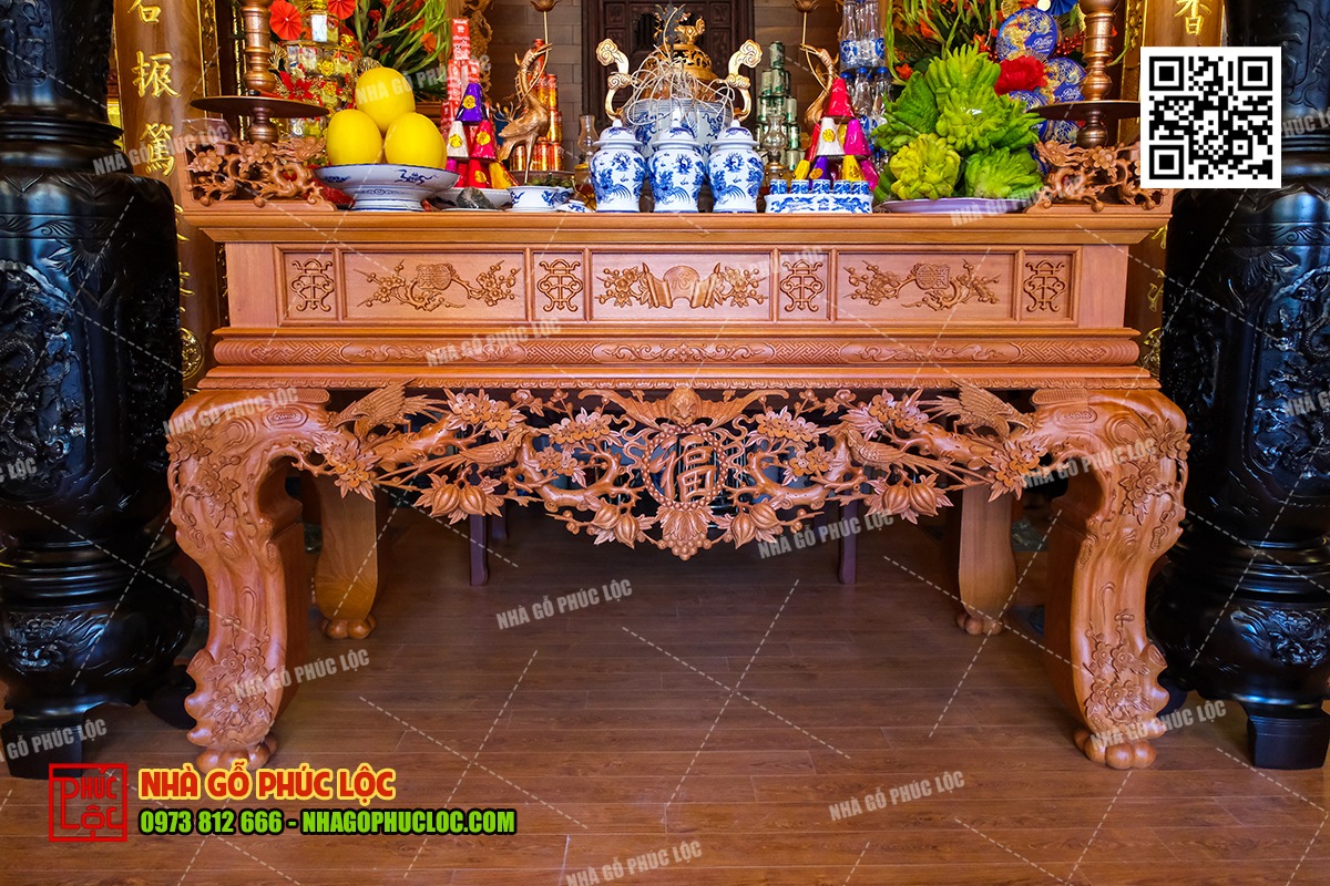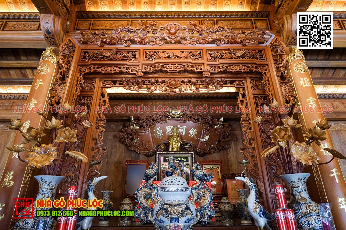 - Trên ban thờ nhà gỗ sẽ có các vật phẩm như: ngai thờ, bát hương, bộ ngũ sự,… mỗi vật phẩm có chức năng riêng, quý vị nên tham khảo những người có kiến thức về phong thủy để được tư vấn bố trí các vật phẩm theo phong thủy giúp mang lại vượng khí cho gia chủ.